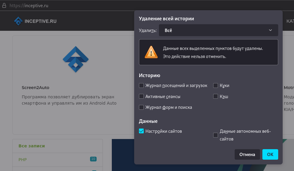 - Нажмите кнопку « ОК» , чтобы очистить все настройки сайта, включая настройки HSTS .