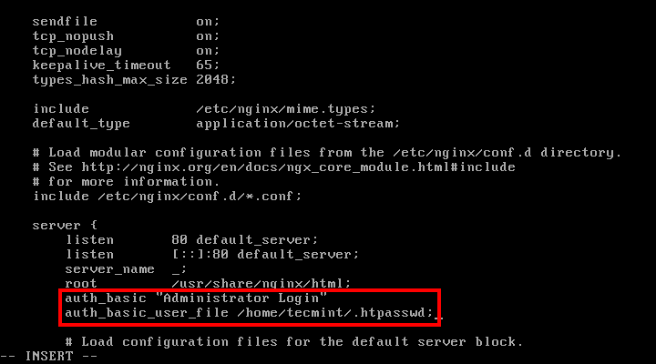 # nano /etc/nginx/sites-enabled/default [For Debian based systems]В нашем примере мы защитим паролем корень каталога для nginx, который: ./usr/share/nginx/html