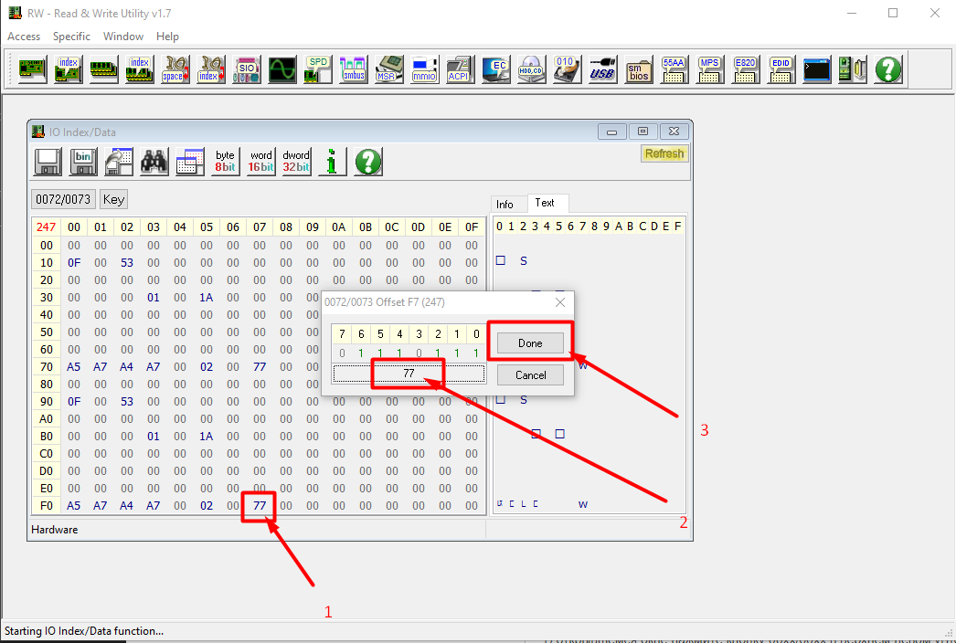 - Найдите строку f0 в столбце 07 [1] в шестнадцатеричной вкладке ниже и нажмите, измените число на 77 [2] в новом окне и нажмите Готово [3].